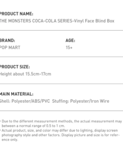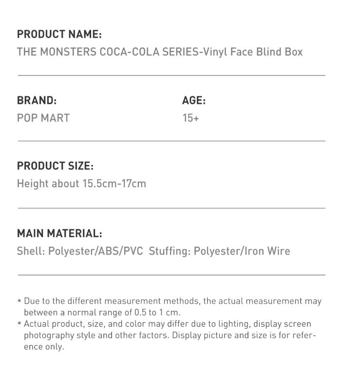 Brand: POP MART Size: Height about 15.5cm-17cm Material: Shell: Polyester/ABS/PVC Stuffing: Polyster/Iron wire