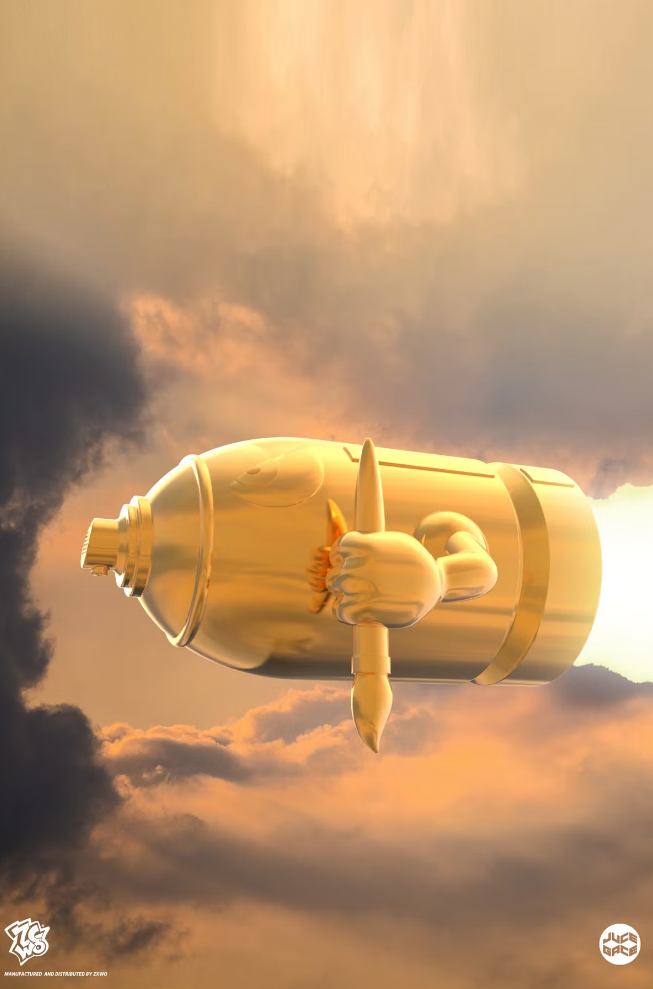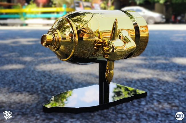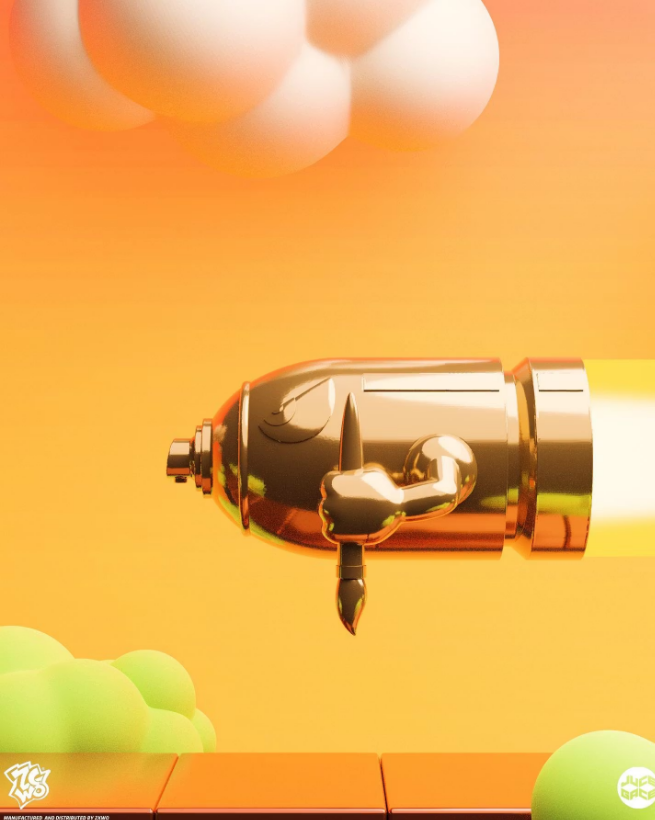If 007’s enemy scaramange had the golden gun what would the French supremo, the father of A Wood Awakening, Juce Gace WAR PAINT (GOLD CHROME EDITION) Juce Gace does it again! homing in on that pop culture but with a slight twist. This time, Juce Gace links up with the ZCWO to present to you “WAR PAINT” a take on Mario’s Bullet Bill! Juce Gace states, “The goal of the piece is to show that you can fight for art instead of war and that it’s better to spread/spray art and peace” Juce Gace for president! The first missile made to spread/spray love and peace with art!